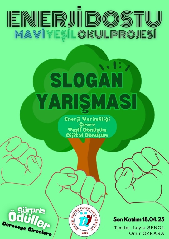 Okulumuz geneli yapılacak olan Enerji Dostu Mavi - Yeşil Okul Projesi kapsamındaki Slogan Yarışması başlamıştır. Son Katılım 18.04.2025...